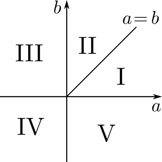 위의 답은 폭Fock과 곤차로프Goncharov가 [5], [7] 에서 증명 없이 제시하였다. 이 $\mathcal{A}_2$의 표준기저 문제는 사실 어떤 거대한 숲에 살고 있는 나무 하나라고 볼 수 있는데, 이는 다음 절에서 다룰 것이다. 약간의 맛보기를 위하여, 위의 답이 내포하고 있는 기하학적 측면을 살펴보자. 각 기저 원소를 이름짓는 정수 순서쌍들 $(a,b)$는 좌표평면 $\mathbb{R}^2$의 정수 격자점들, 즉 좌표 값들이 모두 정수인 점들로 이해할 수 있다. 위의 표에 나오는 정수 격자점들의 다섯 가지의 종류는 그림 1에서와 같이 좌표 평면을 나누는 다섯 개의 영역으로 이해할 수 있다.