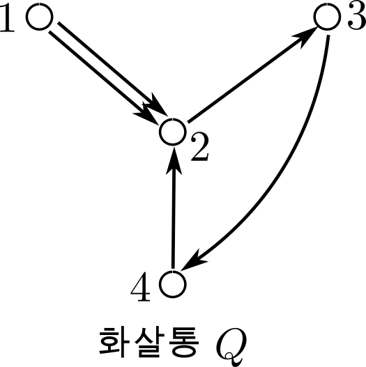 이전 절에서 언급된 숲이란 2000년대 초반부터 연구되어 온 클러스터 다양체cluster variety 이론이다([7] 참조). 클러스터 다양체를 정의하려면 유한 개의 점들과 그들을 잇는 유한 개의 화살표로 이루어진 그래프, 즉 화살통quiver $Q$ 하나를 골라야 한다. 우리는 화살통을 그림 2와 같이 그림으로 나타내고 이해하곤 하지만, 우리의 논의에서는 꼭 화살표들이 곧은 선분일 필요는 없고, 각 화살표에 대해서 중요한 정보는 어느 점에서 시작해서 어느 점까지 가느냐이다. 즉, 점들을 $1,2,\ldots,N$과 같이 이름 붙이면, 각 $i,j \in \{1,\ldots,N\}$에 대해서 점 $i$에서 시작하여 점 $j$로 끝나는 화살표의 개수인 $a_{ij}$들만 알고 있으면 된다는 것이다. 나아서, 클러스터 다양체 이론에서는 화살표 개수의 부호-총합signed net sum인$$\varepsilon_{ij} = a_{ij} – a_{ji}$$만이 유의미하게 필요한 정보이다. 즉 화살통 $Q$를 그림 2와 같이 그림으로 다루어도 되지만, 위의 숫자들 $\varepsilon_{ij}$만 모아서 크기가 $N \times N$ 인 정사각행렬로 만들어 이 행렬만 다루어도 된다.