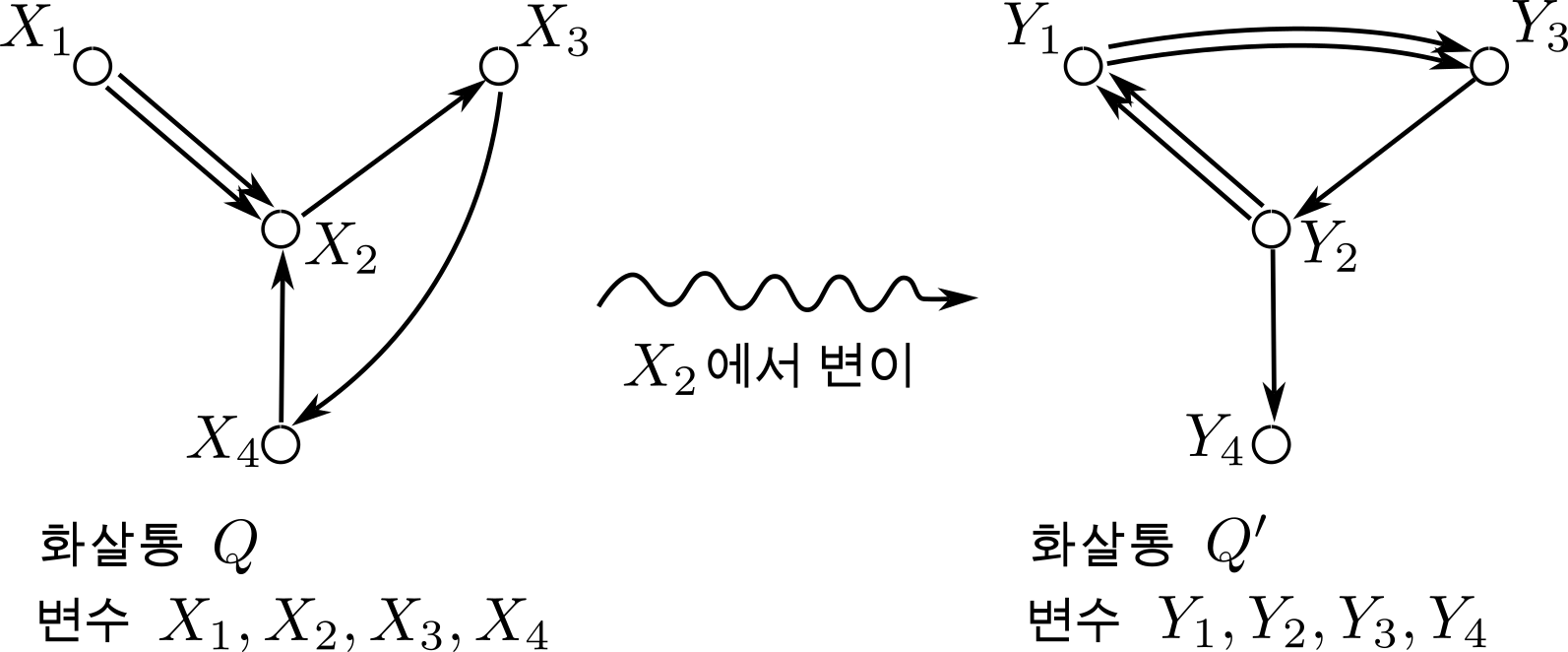 이렇게 로랑 다항식 대수와 그에 부여된 화살통 하나의 쌍을 클러스터 다양체의 씨앗seed라고 부른다. 씨앗 하나에 대해, 화살통의 점 하나 $k$(여기에는 변수 $X_k$가 붙어있다)를 골라서 씨앗의 그 점을 중심으로 한 ‘근방’을 변이mutate시켜서 새로운 씨앗을 생성하는 공식이 있다. 원래의 씨앗의 로랑 다항식 대수를 $\mathbb{Q}[X_1^{\pm 1},\ldots,X_N^{\pm 1}]$, 그 화살통을 $Q$라고 하고, $k$번째 점(혹은 변수 $X_k$)에 대하여 변이를 수행하여 얻어지는 씨앗의 로랑 다항식 대수를 $\mathbb{Q}[Y_1^{\pm 1},\ldots, Y_N^{\pm 1}]$, 그 화살통 대수를 $Q’$라고 하자 (변수들의 이름은 정하기 나름인데, 편의상 $X$와 $Y$를 사용하였다). 그러면 변이된 화살통 $Q’$는 화살통 $Q$에다가 다음의 조합론적인 작업을 수행하여 얻어진다: