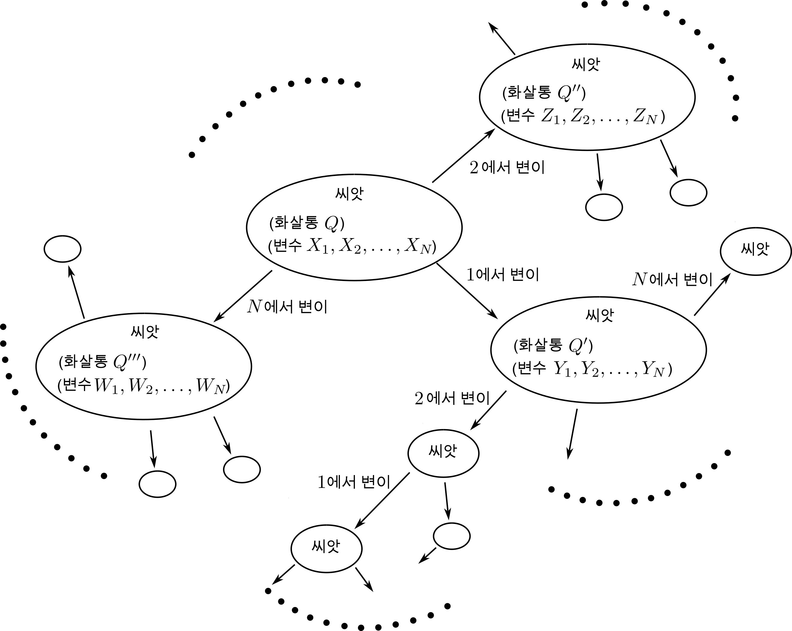 공식의 의미에 대해서 생각하는 대신 일단 공식은 공식으로 받아들이고 좀 더 나아가보자. 씨앗 한 개로부터 시작하면, 씨앗의 화살통의 각 점마다 그 점에 대해 이 씨앗을 변이시켜 $N$개의 새로운 씨앗을 생성할 수 있고, 원래의 씨앗의 로랑 다항식 대수와 각 새로운 씨앗의 로랑 다항식 대수를 이어붙이는 풀칠 공식을 얻는다. 이젠 새로운 씨앗들 각각에 대해서도 변이들을 또 적용하여 더 많은 씨앗을 생성하고, 이 작업을 끝없이 반복한다(그림 4). 일반적으로는 무한 개의 씨앗들을 생성하게 되고, 각 씨앗의 로랑 다항식 대수들을 서로 어떻게 이어 붙일 지에 대한 공식들도 얻게 된다(그림 4에서 볼 수 있듯이, 이것들을 잘 다루려면 효율적인 표기법을 개발해야 할 필요성을 느끼게 된다). 이렇게 한 개의 씨앗에서 시작하여 얻어지는 모든 씨앗들의 로랑 다항식 대수를 전부 이어붙여 얻어지는 대상을 클러스터 다양체라고 부른다. 이 대상은 처음 씨앗이 무엇인지에 따라 결정되고, 처음 씨앗이 가진 유의미한 정보는 사실 화살통 뿐이므로, 임의의 화살통 $Q$ 하나를 고를 때마다 그에 대응하는 클러스터 다양체 하나를 만들 수 있다고 보면 된다. 우리는 편의상 특정한 한 종류의 변수 변이 공식을 풀칠 공식으로 사용했는데, 이 경우는 클러스터 X-다양체 $\mathscr{X}_{|Q|}$를 얻게 된다([엑스 큐 바]로 읽으면 된다). 참고로, 이와는 다른 종류의 변수 변이 공식들도 있고, 그 중 어떤 한 종류를 대신 사용하면 대수적인 성향의 연구자들이 선호하는 클러스터 A-다양체를 얻는다. 아래첨자를 $Q$가 아니고 $|Q|$로 표기한 이유는, $Q$ 대신 $Q$에다가 화살통 변이 공식을 여러 번 적용하여 얻어지는 아무 화살통 $Q’$를 사용해도 같은 클러스터 다양체를 얻는다는 사실을 나타내기 위함이다.