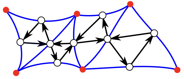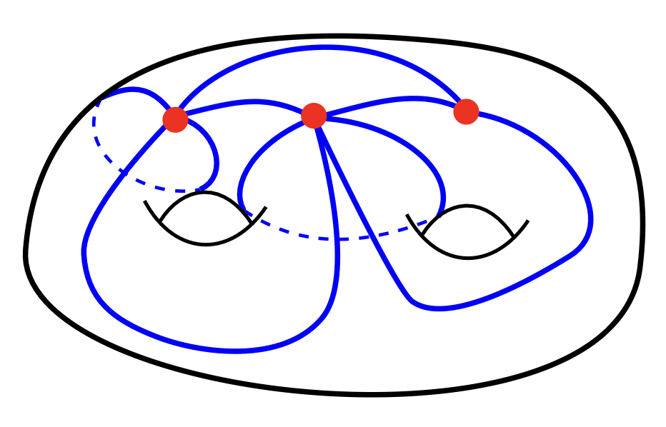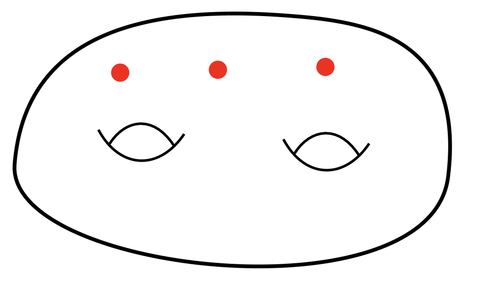 놀라운 점은, 일견 상당히 작위적으로 보이는 공식들을 사용하여 건설된 클러스터 다양체가 수학의 곳곳에서 많이 발견되었다는 점이다. 즉, 위의 공식들로 설명할 수 있는 중요한 수학적 대상이 많다는 것이다. 따라서 클러스터 다양체 일반에 관한 이론을 연구하여 어떤 명제를 얻으면, 많은 중요한 예시들에 적용할 수 있게 된다. 참고로 필자가 가장 오랜 기간 연구한 예시는, 닫힌 유향곡면에서 구멍 여러 개를 뚫어서 얻는 구멍난 곡면punctured surface $S$에 대하여(그림 5), 구멍들을 연결하는 곡선을 여러 개 그어서 $S$를 삼각형들로 분할하고(그림 6; 사실은 더 많은 곡선이 필요하지만 몇 개만 그렸다), 각 삼각형마다 그림 7에서와 같이 주어진 삼각형 모양 화살통들을 모두 이어붙여 얻는 화살통 $Q$의 경우이다. 이 경우 클러스터 다양체 $\mathscr{X}_{|Q|}$가 구멍난 곡면 $S$ 위의 어떤 자연스러운 기하구조들의 모임인 타이히뮐러 공간Teichmüller space과 밀접한 관련이 있어서, 클러스터 다양체에 관한 명제와 문제들을 2차원 기하학과 위상수학으로 해석하고 접근할 수 있게 되고 또한 그 반대 방향으로의 영감도 얻을 수 있어서 매우 흥미롭다([6]).