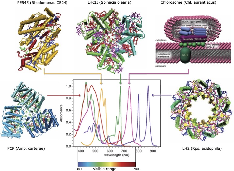 All photosynthetic organisms have light-harvesting complexesLHCs that absorb, retain, and transport the energy from light. These LHCs generally consist of pigment molecules embedded in complex three-dimensional protein structures. Figure 2 shows some important examples of LHCs.