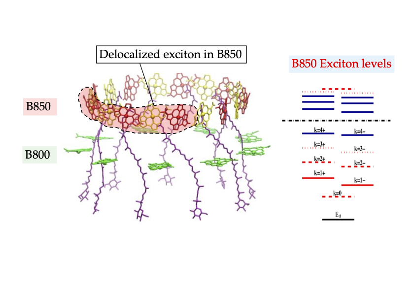 Purple bacteria are ancient photosynthetic organisms that are believed to have evolved more than 2.5 billion years ago2 [6] but are still thriving. In these organisms, LH2s are responsible for the collection and transport of light energy during the early stage of photosynthesis. LH2 consists of B800 and B850 units. The former and the latter absorb light at wavelengths around 800 and 850 nanometers, respectively. Both are composed of circularly arranged bacteriochlorophyllsBChls as pigment molecules (see Fig. 3). In particular, BChls in the B850 unit are closely packed, with nearest neighbors about 1 nanometer apart. The nature of electronic excited states formed in this B850 unit is truly quantum mechanical. These states, known as excitons, are quantum mechanical superpositions of those of individual molecules. Excitons still count as one excitation but have properties of more than one BChl. They are indeed prime examples of delocalized quantum mechanical superposition states. [1]