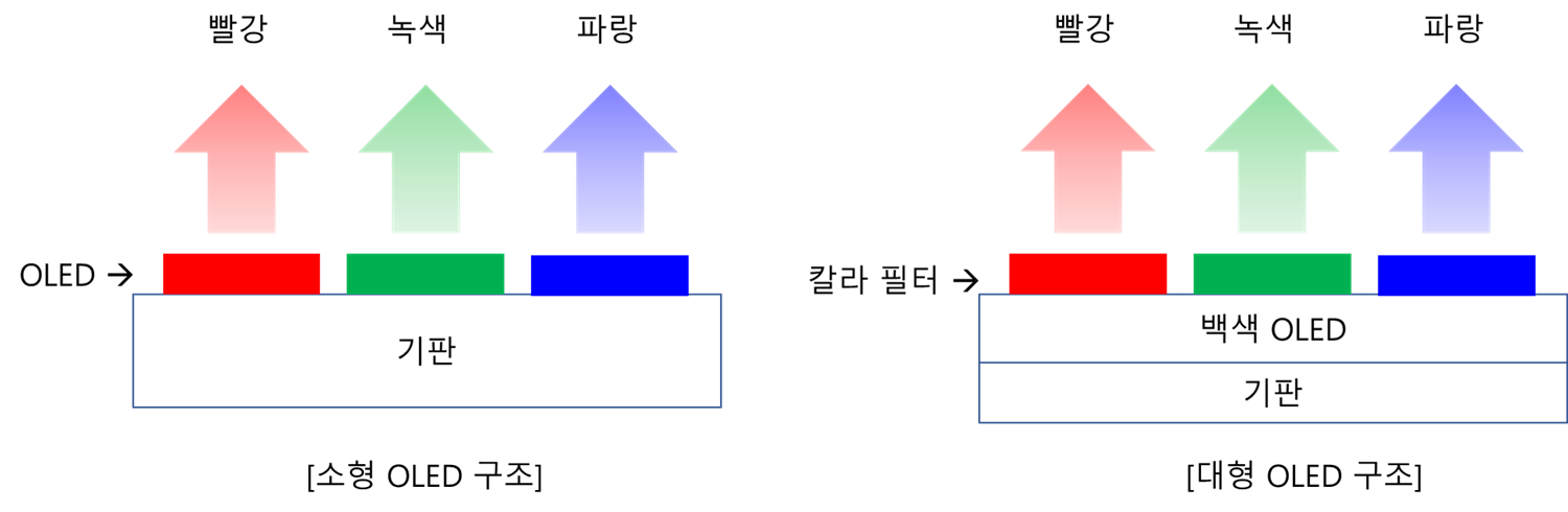 하지만 중소형 OLED의 화소 패턴을 형성하는 증착공정을 대형 OLED에 적용하기는 힘들다. 소형 OLED 화소 패턴의 증착에 사용되는 핵심 부품인 FMM는 그 자체로 대면적 제작이 어려울 뿐 아니라, 제작이 되더라도 대형화에 따른 처짐으로 인해 정렬 오차가 커지는 등 여러 기술적 문제가 발생한다. 따라서 대형 OLED는 [그림 1]의 오른쪽과 같이 백색 OLED 위에 컬러필터 기술을 결합해 화소 구조를 만든다. 컬러필터 공정은 LCD 제조에 오랜 기간 사용되어 온 성숙된 기술이라 OLED의 화소 구조 형성에도 문제가 없다. 정리하자면 대면적 OLED TV는 후면의 백색 OLED가 백색광을 방출하면 화소 구조 내 RGB 컬러필터가 백색광을 받아 일부 파장 대역을 흡수하고 나머지를 통과시키며 빛의 삼원색을 구현해 영상 정보를 표시한다. 물론 화소 단위의 픽셀 디밍이 필요하기 때문에 후면 기판 위, 즉 백색 OLED 층의 아래에 부화소별 박막 트랜지스터가 형성되어 있다. 이런 면에서 백색 OLED는 LCD의 백라이트와 비슷한 역할을 한다고 볼 수도 있다. 최초의 OLED TV는 2013년 55인치 크기로 LG에 의해 출시되었다 [3].