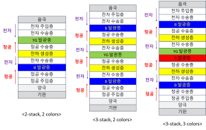 RGB 부화소 구조는 컬러필터에서 형성되기 때문에 백색 OLED의 유기물 증착 공정에는 FMM를 사용할 필요가 없다. 대면적 OLED에서 백색광의 형성에는 서로 다른 색상을 방출하는 다층 구조가 활용된다. 2013년 최초로 출시된 OLED는 [그림 2] [4]의 왼쪽 그림처럼 2층2-stack의 발광 구조를 갖고 있었다. 한 층은 청색B 발광을 하고 다른 층에서는 노랑-녹색YG 발광을 함으로써 두 색을 혼합해 백색광을 만들었다. 그런데 지난 글에서 OLED의 발광은 양 전극에서 전자와 정공이 공급되어 엑시톤을 형성함으로써 이루어진다고 설명한 바 있다. 따라서 두 발광층에 전자와 정공이 균형 있게 공급되기 위해서는 두 발광층의 사이에 “전하 생성층charge generation layer, CGL”을 형성해, 그림처럼 각 발광층에 전자와 정공을 지속적으로 보충해 줘야 한다. 발광층이 늘어날수록 전하생성층의 수도 비례해 증가한다. 보통 청색 발광물질은 효율이 낮고 수명 상 문제가 발생할 소지가 커서 전류를 증가시켜 밝기를 키우기는 힘들다. 따라서 장수명, 고휘도 구현을 위해 청색 발광층을 두 층으로 형성하는 3층의 탠덤tandem 발광 구조가 개발되었다 [5, 6] ([그림 2]의 가운데 그림). 그후 [그림 2]의 오른쪽 구조와 같이 적색R 발광층을 추가 도입하고 컬러필터의 투과도 곡선도 조정해 색역color gamut을 개선한 제품이 등장했다 [7]. 최근에는 청색 발광층의 발광 스펙트럼을 더 좁힌 재료에 더해 녹색 발광층까지 추가하며 밝기 특성을 개선한 구조도 개발되었다.