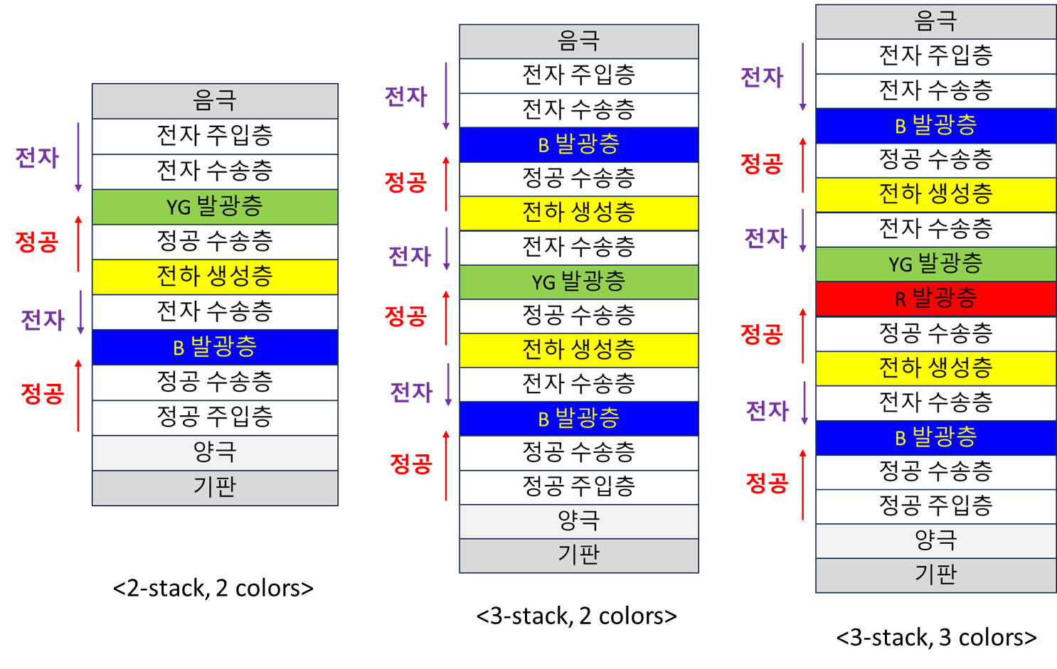 - 중소형 OLED의 경우에도 장수명, 고휘도를 위해 RGB 부화소가 형성되는 발광층을 2층(2-stack)의 탠덤형으로 쌓은 구조가 있다.