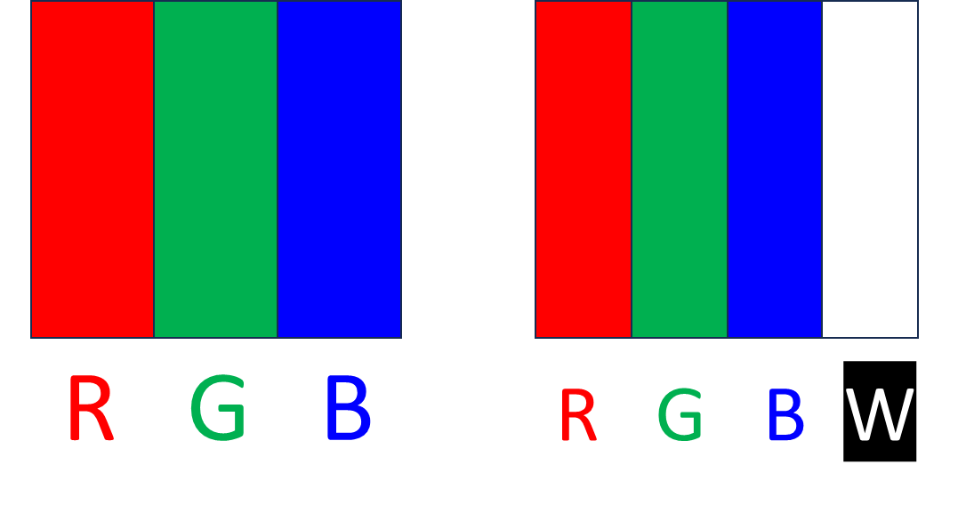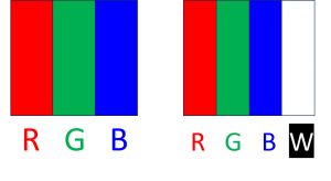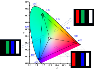 OLED TV의 또 다른 특징은 전통적인 RGB 화소 구조 대신 RGB에 백색white 부화소를 포함해 총 네 개의 부화소RGBW를 가진 화소 구조를 채택했다는 점이다. 이는 보통의 TV 영상 신호에 채도가 높은 색상보다는 백색의 색감이 강한 영상이 표시되는 비중이 높다는 사실에 근거한다. OLED TV에 적용된 컬러필터에서는 발광층이 방출하는 백색광의 약 3분의 2가 흡수되어 사라지기 때문에 낮은 발광 효율의 원인이 된다. 반면에 백색 부화소에서는 컬러필터에 의한 흡수 손실을 피할 수 있어 OLED TV의 효율을 높이고 소비전력을 줄일 수 있다. 게다가 백색 부화소는 휘도(밝기)를 형성하는 중요한 요소이므로 이를 적절히 활용해 영상 속 경계를 선명히 함으로써 영상의 질을 높이는 도구로도 활용된다. [그림 4]는 색도도CIE 1931 chromaticity diagram 상에서 RGBW 등 네 부화소를 조합함에 따라 OLED TV의 색역이 어떻게 구현될 수 있는지 보여준다. 색도도의 중앙에 백색 부화소의 색좌표가 놓인 후 나머지 RGB 삼원색 중 두 부화소와 결합하면 그림 상 세 개의 작은 삼각형 속 색상들을 구현할 수 있다. 가령 백색+녹색+청색 부화소들의 조합으로는 색도도의 왼쪽 삼각형에 포함된 색상들이 표현된다.