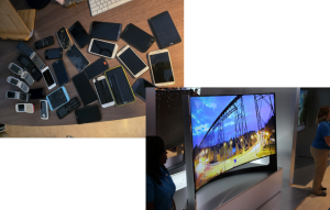 지난 8월 중순 서울 코엑스에서 개최된 K-display 전시회에선 삼성이 폴더블폰의 내구성 테스트 장비를 직접 시연했다. 다양한 조건 하에서 폴더블 화면을 접었다 펴는 동작을 반복하던 장비의 시연은 폴더블 디스플레이의 내구성에 대한 삼성의 자신감을 보여준 현장이었다 [8]. [그림 5]의 위는 필자가 디스플레이공학 관련 강의 시간에 활용하기 위해 보관 중인 과거 휴대폰들을 찍은 사진이다. 온갖 크기와 배치, 다양한 물리적 키보드 등으로 구분되는 이 기기들은 예외 없이 디스플레이의 직사각형 화면이 평평하고 형상이 고정되어 있다는 공통점을 갖는다. 노트북, 모니터, TV도 대부분 딱딱하고 고정된 화면이란 특징을 공유한다. 물론 제한적이나마 곡면을 갖는 커브드curved LCD 제품이 출시되고 있으나 이들 제품에선 화면의 곡률이 고정되어 있다. 이런 유형의 곡면 디스플레이는 화면 가장자리의 왜곡을 줄이고 사용자의 몰입감을 극대화하는 용도로 개발되었다. 평판 디스플레이 패널에 곡률을 주기 위해선 유리 기판이 휘어야 한다. 보통 양쪽이 지지된 상태로 놓인 유리에 적당한 온도를 가한 후 중력에 의한 처짐을 이용하는 ‘열 처짐 성형thermal slumping’ 공정 [9]을 써서 커브드 디스플레이의 완만한 곡면을 구현한다. 기타 재료나 광학 부품들 역시 최종 제품이 갖는 곡률을 고려해 설계되어야 함은 물론이다.