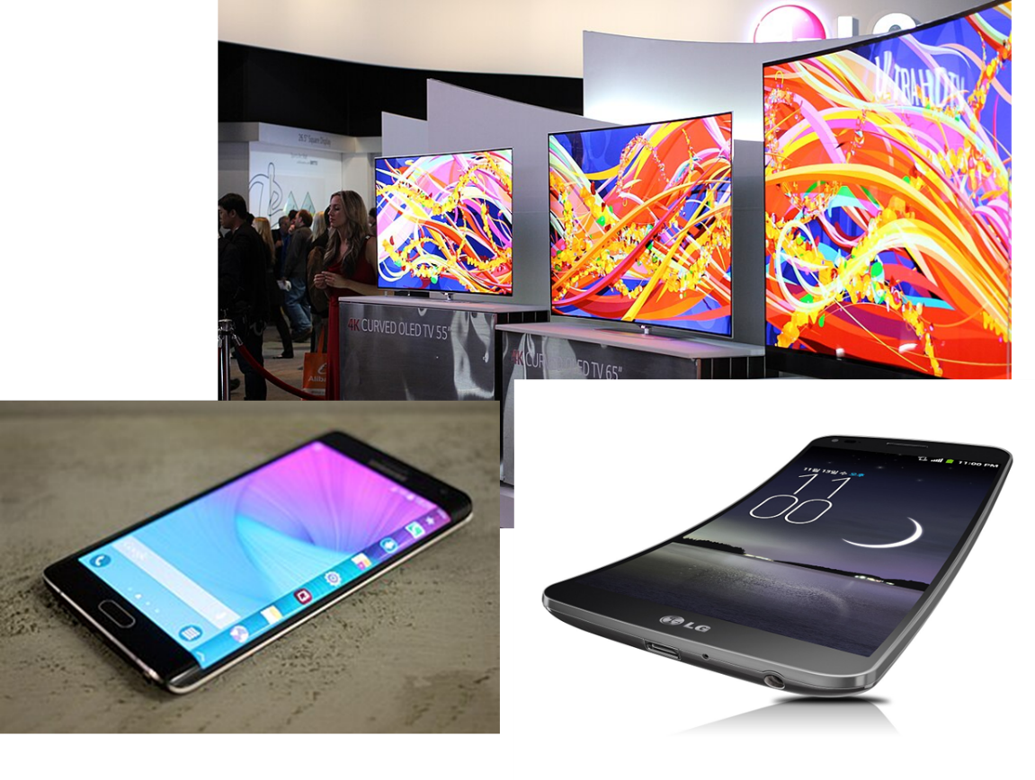 백라이트가 필요 없는 OLED는 곡면 대응 혹은 화면 변형에 있어 훨씬 유리하다. LG와 삼성은 2013년에 이미 곡면 OLED TV를 전시회에 출품한 바 있고, 일부 제품은 실제 상용화로 이어졌다 ([그림 6]의 위 참조). 고정된 곡률을 가진 제품은 스마트폰 분야에서도 등장한 적이 있었다. 2010년대 중반 엘지의 ‘G 플렉스’ 스마트폰과 삼성에서 출시한 ‘갤럭시 노트 엣지’가 그 예로서 [그림 6]의 아래에 제품들의 사진이 보인다. 곡률을 주어 화면 몰입감을 강화하려는 G 플렉스 및 엣지 창을 통해 새로운 사용자 경험을 창출하려 한 두 스마트폰은 기존의 평면형 화면을 탈피했다는 면에서 출시 당시에 큰 화제를 모았다.