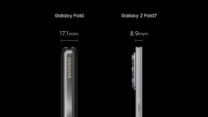 2019년 최초의 폴더블폰인 갤럭시 폴드1을 출시한 삼성은 매년 제품의 성능을 개선하며 폴더블폰 시장을 주도해 왔다. [그림 7]은 갤럭시 폴드1과 2025년 출시된 폴드7의 측면을 비교한 사진이다. 이 사진은 지난 6년 동안 기술 혁신을 통해 두께가 무려 8.2 mm나 감소했음을 생생히 보여준다. 최근에는 중국 업체들의 참전으로 인해 폴더블폰의 두께 경쟁이 갈수록 더 치열해지는 추세다. 게다가 두 번 접히는 구조를 가진 트리플폰이 작년 중국의 화웨이에 의해 출시되면서 폴더블폰의 화면 크기 경쟁도 심해지는 중이다. 소량이기는 하나 노트북 제품 중에서도 폴더블 노트북이 출시되었지만 높은 가격과 제한된 성능으로 인해 폴더블폰 정도로 대중화되지는 못한 상황이다.