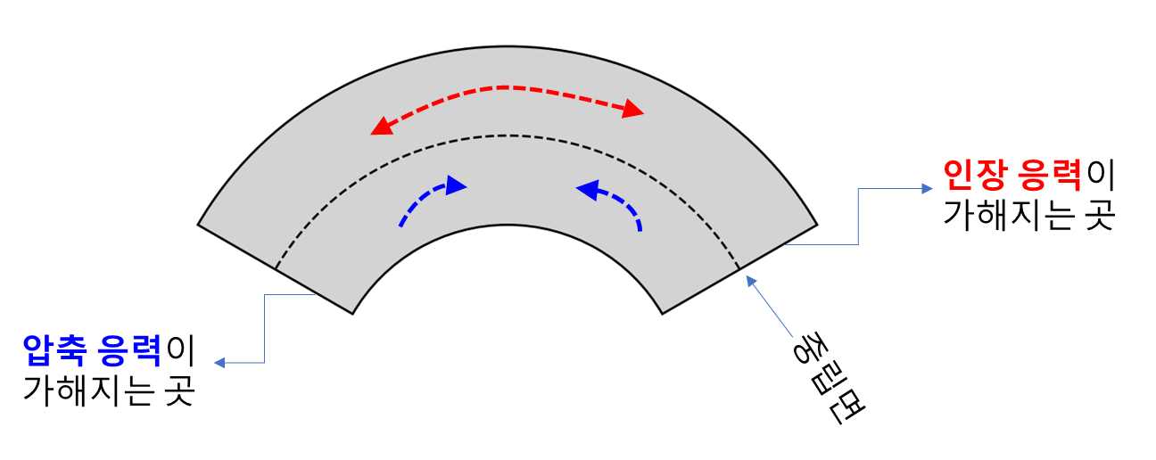 화면이 접히는 디스플레이에 있어 가장 큰 기술적 이슈는 화면이 접히는 부위의 곡률 반지름 감소에 따른 기계적 신뢰성의 확보다. 롤러블 TV의 곡률이 대략 종이컵이나 500원 동전과 비슷하다면, 폴더블폰에서 화면의 접히는 부분은 1~2 mm 정도의 곡률 반지름을 갖는다. 따라서 접힘에 따른 응력(스트레스)이 기계적 변형을 유도하면, 화면 내 결함을 발생시켜 영상 구현에 문제를 일으키거나 봉지층encapsulation layer에 산소나 수분이 침투해 확산할 경로를 만들어 신뢰성에 문제를 일으킬 가능성이 높다. 폴더블 OLED를 구부려 휘면 [그림 8]과 같이 내부는 줄어드는 압력을 받는 압축 응력compressive stress, 외부는 늘어나는 압력을 받는 인장 응력tensile stress이 가해진다. 이 응력으로 인해 막이 분리되거나 균열이 발생하기 쉽다. 인장 응력과 압축 응력 사이에 응력이 0인 중립면neutral plane이 존재한다. 중립면에서 멀어질수록 휨에 의한 응력이 커지기 때문에, 응력으로부터 폴더블 화면을 보호하는데 있어 중립면의 위치를 최적화하는 것이 매우 중요하다 [10]. OLED의 유기층들은 이 중립면에 가까운 위치로 설계되어야 응력에 의한 영향을 줄일 수 있다. 가령 점착면을 고려하면서 여러 개의 중립면을 배치해 접힘에 의한 변형을 최소화하는 등 여러 방향으로 응력의 영향을 줄이기 위한 노력이 이루어져 왔다. 게다가 소자가 작동하는 온도 범위에서 변형 후 원래 형상으로 돌아오는 탄성 회복력을 계속 유지하는 것도 중요하다. 이를 위해 우수한 연신력과 회복력을 가진 영역을 교대로 배치한 패턴화된 점착층을 개발하는 등 다양한 연구가 이루어져 왔다.