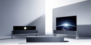 폴더블폰이 오늘날 플렉서블 디스플레이를 대표하는 아이콘이 되었지만, 현재까지 출시되었던 제품 중 가장 인상적인 형상 변화를 보여준 제품은 아마도 롤러블 OLED 디스플레이가 아닐까 싶다 [13]. LG가 출시한 적이 있는 롤러블 TV의 특성을 보면 하단의 TV 박스 속에 설치된, 곡률 반지름이 4 cm인 롤에 감겨 있는 플렉서블 OLED 화면이 시청자가 원하는 만큼 위로 올라오는 구조로 디자인되었다. 이에 따라 [그림 9]처럼 일부의 화면만 올려서 정보 표시용 가로 디스플레이로 활용할 수도 있고 전체 화면이 보이는 65인치 디스플레이 TV로 변신을 시킬 수도 있었다 [14]. 비록 초고가로 책정된 제품 가격과 단일 화면 크기로 인해 단종된 상태지만, 롤러블 디스플레이의 각 요소 기술을 활용한다면 향후 휴대용 롤러블 디스플레이 제품의 등장도 기대할 수 있을 것 같다.