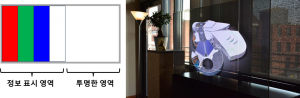 OLED 기술이 가치를 발휘할 수 있는 또 하나의 응용 분야는 투명 디스플레이다. 최근 디스플레이 전시장에 단골로 등장하는 OLED 투명 디스플레이는 후면의 사물들이 뚜렷이 인지되면서 아울러 적당한 화질의 영상이 동시에 띄워지는 특성을 갖는다. 디스플레이 패널을 구성하는 모든 요소를 투명하게 만들어 투과도를 높이는 데는 어느 정도 한계가 있을 수밖에 없어, [그림 10]과 같이 한 화소 내에 정보를 표시하는 영역과 투과도가 상당히 높은 투명 영역을 나누어 배치함으로써 투명 디스플레이를 구현한다. 물론 정보표시 영역을 구성하는 컬러필터, 회로, 봉지재, 투명전극 등도 구성 요소로서의 역할을 제대로 해내면서 가능한 한 높은 투명도를 유지해야 한다.