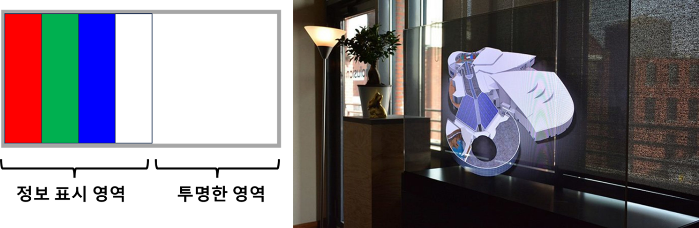 투명디스플레이는 기차역이나 안내데스크와 같은 공공 장소에서 인포메이션 디스플레이로 유용하게 활용될 수도 있지만, 상업용으로도 충분한 활용 가치를 가질 것으로 기대된다. 예를 들어 백화점에서 스포트라이트를 주고 싶은 상품 앞에 투명 디스플레이를 설치한 후 상품에 대한 설명 혹은 상품과 어울리는 감성 영상을 구현함으로써 판매 대상이 되는 제품의 가치를 부각시킬 수 있다. 최근에 실제로 일부 매장이나 지하철역에서 시범적으로 투명 디스플레이를 도입해 운용하고 있다는 뉴스가 나온 적이 있다 [15]. 그 외에 실내 인테리어용 디스플레이, 사무실의 업무용 혹은 자율주행 자동차의 스마트 유리 등 투명 디스플레이의 활용도가 빛날 응용 분야는 더욱 다양해질 것이다.