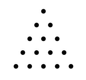 은 $n$번째 삼각수triangular number라 불리는데, 그 이유는 아래의 그림처럼 첫 번째 줄에 $1$개, 두 번째 줄에 $2$개, 세 번째 줄에 $3$개, $\ldots$\,\,, $n$번째 줄에 $n$개의 점을 배열하면 정삼각형 모양이 되기 때문입니다. 이때 전체 점의 개수가 $n$번째 삼각수입니다. 예를 들어, 다섯 번째 삼각수는