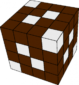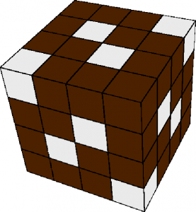 D)의 그림자를 드리우는 입체를 찾기 위해서 다음과 같이 접근해볼 수 있다. 먼저 모양을 단순화시키기 위해 다음과 같은 그림자를 드리울 수 있도록 각 면마다 4군데씩 구멍을 뚫으려고 해 보자.