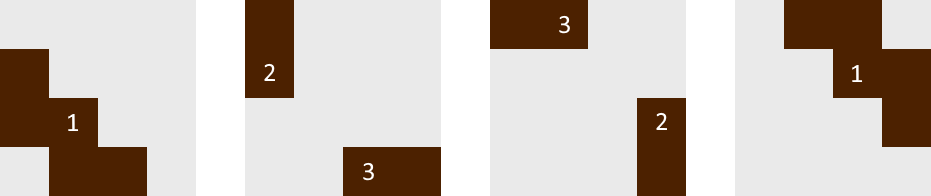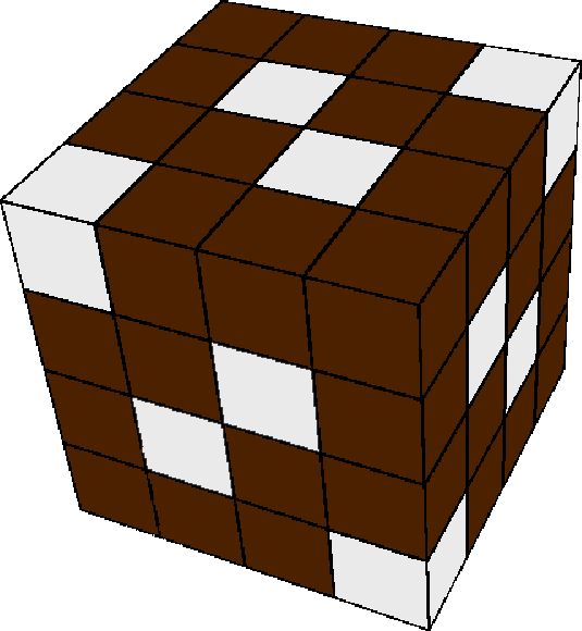 먼저 중요한 접근법을 알아두자. 특정 모양이 그림자로 나오게 하기 위해서는 적어도 빛이 보이는 부분은 비어 있어야 하므로, 4×4×4 정육면체에서 빛이 통과해야 하는 부분에 일자로 구멍을 파 버리는 방식으로 접근할 수 있다. 그러면 그림자가 지는 부분을 보장하지는 못하지만 최소한 빛이 드는 부분은 보장할 수 있다. 정답 입체가 존재한다면 여기에서 쌓기나무를 추가로 제거하는 방식으로 만들어질 수 있어야만 한다. 물론 각 면마다 그림자의 방향이 어때야 하는지는 알 수 없으므로 여러 번의 시도는 필요하다.