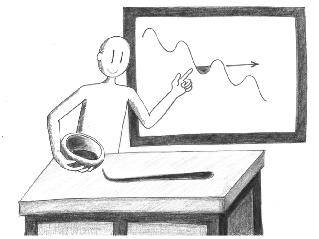 그릇을 반쯤 채운 물이 그릇 안에서 아무런 저항 없이 앞뒤로 자유롭게 흔들거리고 있다. 나는 그 물을 그릇 밖으로 쏟아 버리고 싶어 그릇을 기울인다. 만약 내가 그릇을 충분히 많이 기울인다면 물은 그릇의 벽을 뛰어 넘어 그릇 밖으로 흘러 넘칠 것이다.