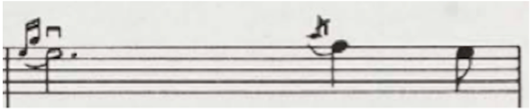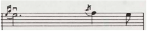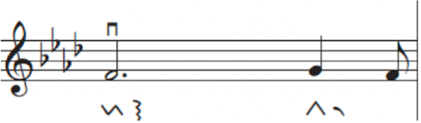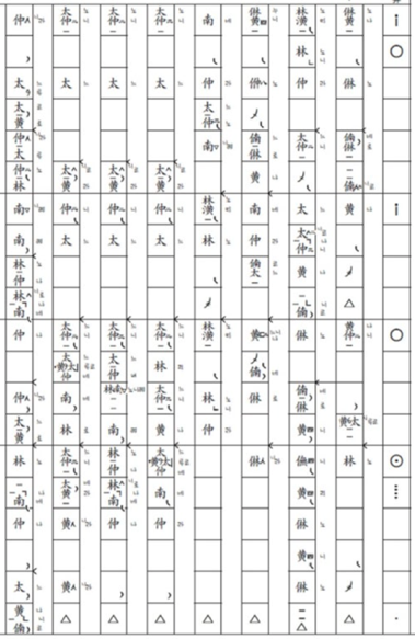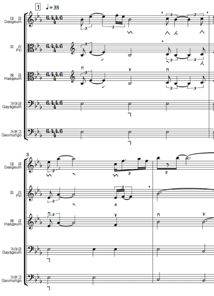 정간보에 담긴 우리 음악을 수리적으로 해석하기 위해서 우선 정간보를 오선보 데이터로 변환하였는데, 이것은 기존에 만들어진 음악 처리 방법론을 사용하기 용이한 까닭이다. 정간보에서 오선보로 혹은 오선보에서 정간보로 변환하게 되면, 그 변환 사이에는 어느 정도의 정보손실information loss이 발생하는데 이를 최소화하는 것이 중요하다. 정간공간에 기록된 음고와 음가는 변환과정에서 그 겪는 정보손실이 거의 없다고 할 수 있는데, 주요한 정보손실은 정간의 언저리에 적힌 시김새6와 장식음을 변환할 때 발생한다. 시김새와 장식음은 연주자나 계파에 따라서 충분히 다르게 해석될 수 있기 때문에 정간보-오선보, 다시 오선보-정간보의 변환이 일대일one-to-one의 유일한 변환이 되는 것은 보통 어렵다. 본 연구단에서는 이를 해결하기 위해서 정간보에 기록된 상징들을 고스란히 오선보의 가사줄로 평행이동시켜 기보하는 방법을 제안하였다.7 예를 들어서 <수제천>의 해금보 중 일부를 발췌한 그림 2의 악보를 보자.