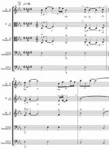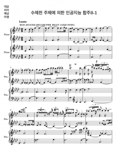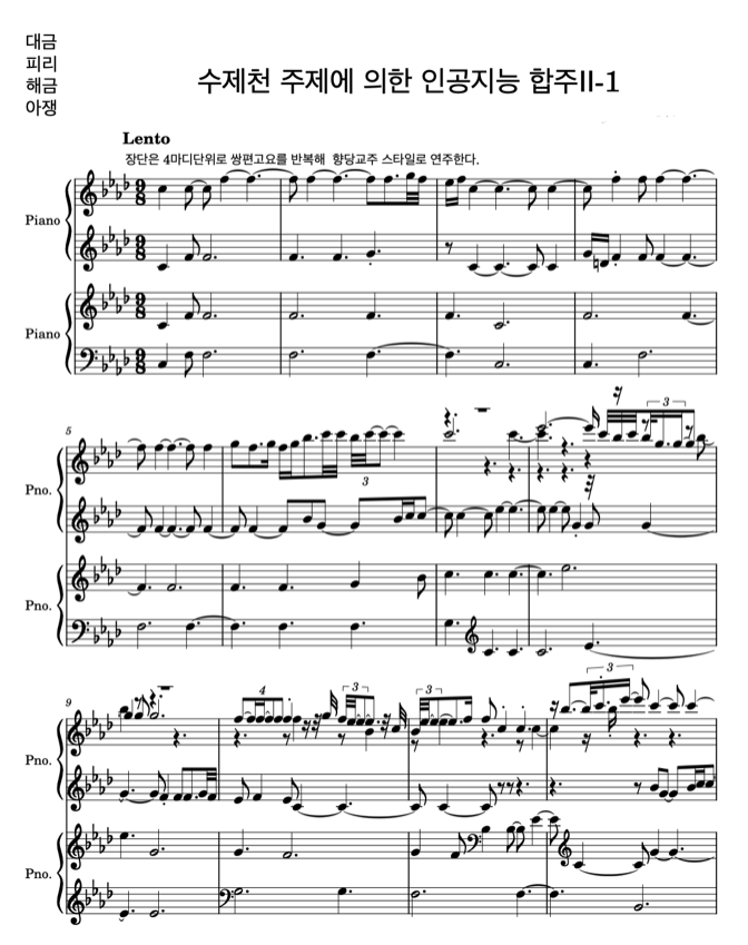 연구단의 초기 인공지능 작품은 주로 단일 곡, 단일 악기 중심의 생성에 초점을 두었다. 이는 확률모형의 기본 구조를 검증하고, 개별 음열 차원의 위상적 패턴을 안정적으로 학습하는 데 목적이 있었다. 최근에는 연구 범위를 확장하여 국악 앙상블 음악의 전역적 위상 구조를 반영한 생성 모델을 만들어 국악 앙상블 음악을 생성했다. 이는 단순히 여러 악기를 병렬적으로 배치하는 것을 넘어, 악기 간 관계와 상호작용의 위상적 구조를 흉내 내보려는 시도이다. 특히 국악 앙상블은 서양 음악과 달리 수직적 화성 구조가 아닌, 동일한 선율을 각 악기가 미세하게 변주하며 전개하는 헤테로포니heterophony적20 질감을 특징으로 한다. 연구단은 각 악기 선율이 공유하는 중심 선율적 흐름과 장단 구조, 그리고 그 위에서 발생하는 미세한 변이 관계를 하나의 위상적 전역 구조로 계량화하고, 이를 생성 과정에 제약 조건으로 반영하는 모델을 설계하였다. 그 예로, 국악의 대표적 기악 합주곡이자 ‘천상의 음악’으로 불리는 <수제천>21의 구조적 특성을 학습한 인공지능 앙상블 작품을 작곡하고 실연하였다. 그림 11은 2024년 12월 8일 수림문화재단 스페이스 1홀에서 초연되었던 인공지능 국악 앙상블 <수제천 주제에 의한 인공지능 합주 II-1> 의 처음 몇 소절이다. 이 작품은 대금, 피리, 해금, 아쟁 네 악기의 헤테로포니 구조의 전개 원리를 위상적으로 재구성한 사례로서 의미를 지닌다. 실제 연주를 통해 악기 간 상호 긴장과 미묘한 차이가 자연스럽게 구현되었으며, 이는 모델이 단순 음열 생성 단계를 넘어 국악 앙상블의 구조를 잘 구현한 성과라고 할 수 있다. 여기서 한가지 말해 두어야 할 것이 있다. 이 곡은 이러한 기법으로 만든 악보로 출력된 수 십 곡의 인공지능 음악 중 하나이다. 어떤 곡은 사람이 연주하기에 매우 어렵거나 거의 불가능했다. 그 중 사람이 연주하기에 가장 적당한 곡을 고른 것인데, 그래도 악보로만 내 던져진 음악은 쉽사리 연주할 수준이 아니었다. 사람 연주자가, 만들어진 곡의 호흡을 찾아내고 악보를 오래도록 묵상하고 해석하는 수고를 해 주어 실제 연주가 가능했으니 인공지능 음악은 사람과의 협업으로 비로소 완성되는 것임을 다시금 깨달을 수 있었다.