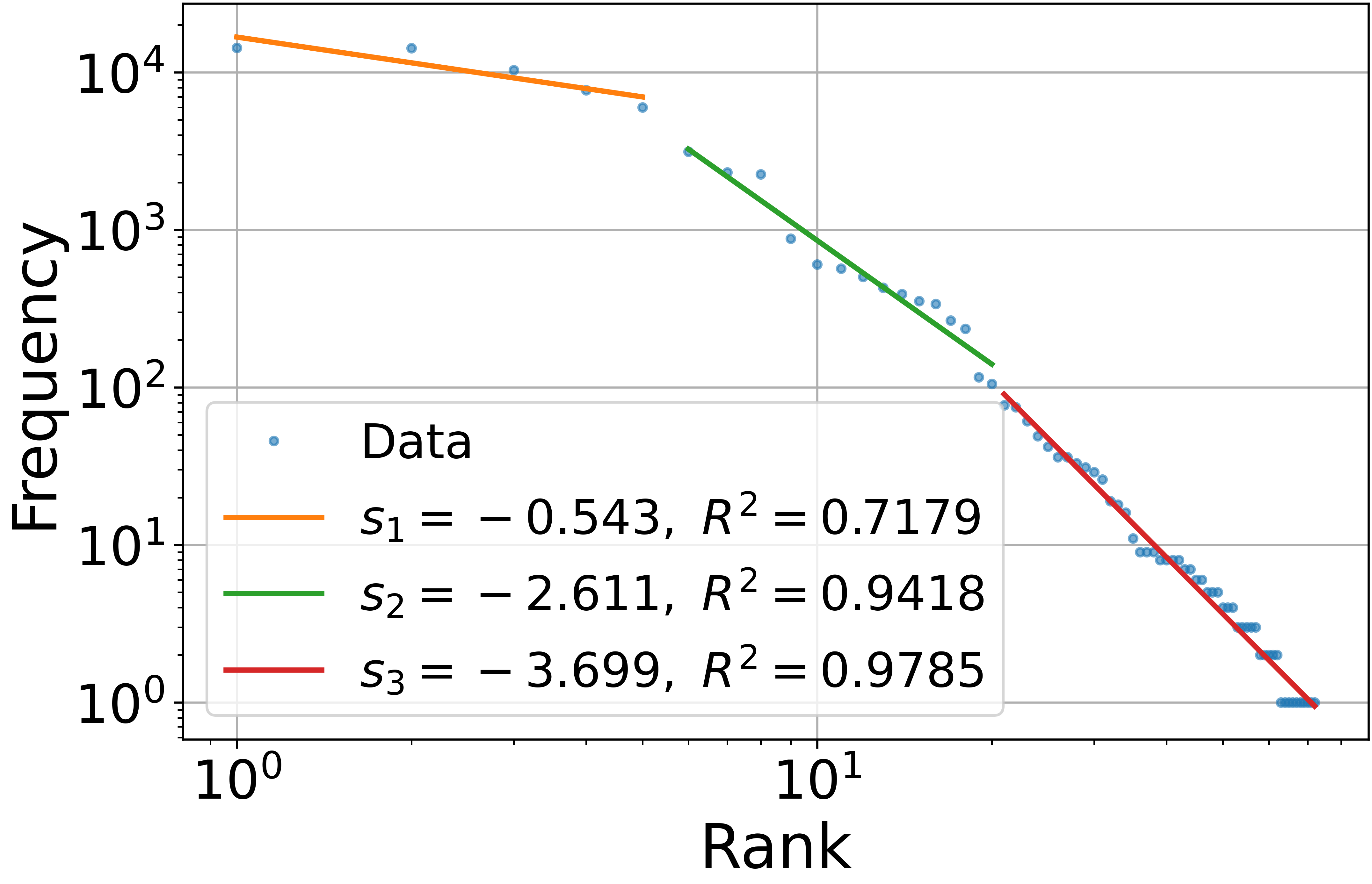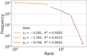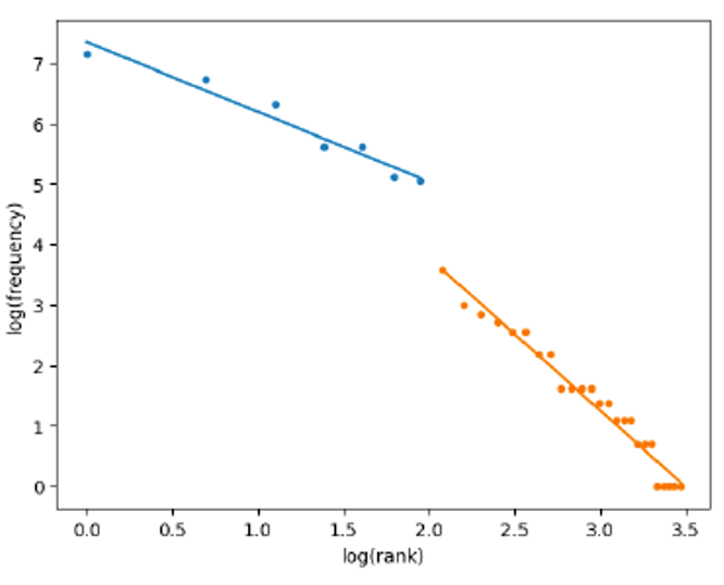 지프 법칙이 음악 데이터에도 적용된다는 연구는 서양 음악에서는 오래 전부터 시도되었다. 지프 법칙에 나타나는 지수 는 주어진 데이터에 대한 매우 중요한 해석 정보를 담고 있다. 예를 들어서 그림 4는 1600년대 활동했던 키르헤Athanasius Kircher, 1601/1602 – 1680의 신타그마Syntagma I 음악 데이터에 나타난 코드를 log-log 스케일로, 그 순위를 \(x\) 축에 그리고 빈도수를 \(y\) 축에 그린 것이다. 그림에서 보듯이 지프 법칙이 구간별로 성립한다. 이 경우는 두개의 \(s\) 값이 계산되는데 실제로 처음 분포는 정확히 장조major에 그리고 다음 분포는 단조minor에 해당하며 각 각의 그룹은 다른 기울기 값 을 갖는 것을 볼 수 있다. \(s\) 값이 다른 것으로 보아 음악내에서의 두 그룹의 쓰임새가 다르다고 해석할 수 있다.