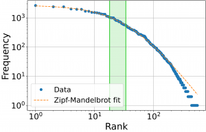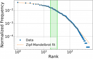 사이의 빈도수 차이가 멱법칙power-law에 의해 매우 크다는 것을 보여준다. 주로 자연어에서 출현하여 의미론적으로 이 법칙을 해석할 수 있고, 정보를 주고 받는 과정에서의 정보전달의 효율성과 최소 에너지의 관점 등 정보이론의 관점에서 이 현상을 해석할 수 있다. 만약 데이터를 구성하는 모든 이산적 요소가 무작위로 데이터를 생성해 낸다면 \(f(r)\) 는 거의 균일한 분포를 보일 것이다. 그런데 멱법칙을 만족한다면 데이터 생성에 어떤 원리가 개입한다는 것이고 그 원리는 의미론적이며 그 내용은 라는 지수에 함축되어 있다. 이 법칙은 프랙탈 기하학의 만델브로트Benoît Mandelbrot, 1924–2010 에 의해 아래와 같은 형식의 지프-만델브로트 법칙Zipf-Mandelbrot law로 확장되었는데 좀 더 포괄적인 데이터에 적용할 수 있다.12