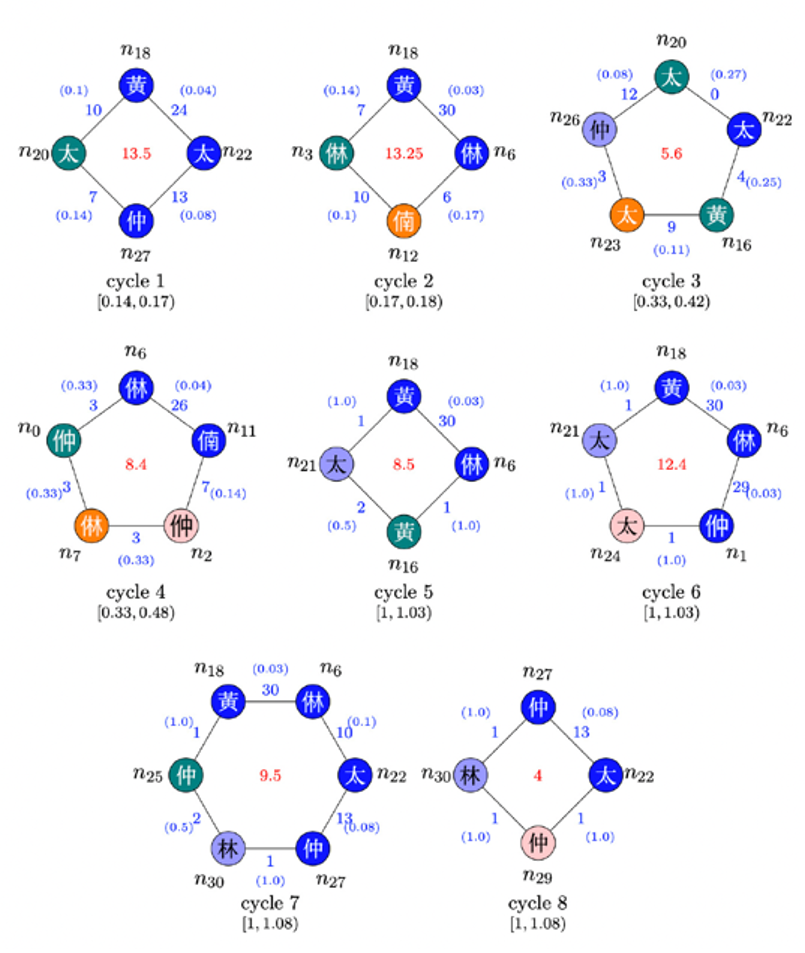 그 구체적인 내용을 이 자리에서 다 적기에는 한계가 있으므로 위상수학을 이용한 연구의 결과를 중심으로 우리가 발견한 사실을 간단히 적어보자. 우선 <밑도드리>에 나오는 음들을 음고와 음가의 쌍으로 노드를 정의하는 경우 해금 <밑도드리> 정간보 음악에는 33개의 서로 다른 노드가 존재한다. 이 33개의 노드는 <밑도드리> 음악을 만들기 위한 재료가 되는 것이다. <밑도드리> 음악은 시간에 따라 이 노드들을 통과하며 흐르는 시계열데이터이다. 방금 거쳐 온 노드를 어느 순간에는 다시 거쳐 지나갈 수도 있고 또 어떤 노드들은 서로 몰려 있으면서 음악이 그 노드들을 혹은 그 노드들의 주변에서 빙그르르 돌기도 하면서 환입의 형태를 보이기도 한다. 이 노드들 간의 친근성을 노드간의 거리로 정의하였는데 앞서 말한 호몰로지를 계산하면서 그림 8에서 보듯이 <밑도드리> 그래프에는 8개의 1차원 싸이클(구멍)이 존재하는 것을 발견하였다.18 어떤 싸이클은 정간보 악보에서 고스란히 보이기도 했지만 그림에 있는 7번과 8번 싸이클처럼 정간보에서 바로 보이지 않는 싸이클도 있다. 그림에서 동그라미는 노드에 해당하고 동그라미 안에 적힌 한자는 그 노드의 음고를 나타낸다. 노드와 노드를 연결한 선 위에는 등장 빈도수와 그에 대한 거리를 괄호 안에 표시하였다. 어떤 싸이클들은 서로 노드를 공유하고 있음도 알 수 있다. 이 싸이클들이 실제 음악에서 어떤 의미를 갖는지에 대한 선율적 분석은 연구단의 논문을 참조하기 바란다.19