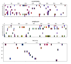 놀라운 것은 이 1차원 싸이클들이 음악이 흘러가면서 나타났다가 없어지기를 특이한 패턴을 따라 반복한다는 것이었다. 그림 9는 그 패턴을 스케일\(s = 4\) 에서 보여준다. 이 그림 속 각 네모칸을 중첩행렬이라고 부르고 중첩행렬은 노드 시퀀스로 음악이 진행될 때 이 노드가 어떤 싸이클에 속해 있는지를 시각화한 것이다. 중첩행렬에서 행은 싸이클을 열은 음악 시퀀스를 나타낸다. 여기서 스케일 \(s = 4\) 이라는 것은 한 싸이클의 노드들이 4 열 이상 연속적으로 나타나는 경우로 제한하여 중첩행렬을 생성하는 것을 말한다. 정의상 \(s\) 가 커질수로 이 행렬은 sparse 해 진다. 위 중첩행렬은 <밑도드리>, 중간은 <웃도드리>, 아래는 도드리 형식의 곡이 아닌 <타령>에서 발견되는 패턴이다. 수평축은 음악이 진행하는 시간을 의미하고 수직축은 위로부터 아래까지 첫 싸이클에서 마지막 싸이클을 나타낸다. 수직축의 값은 의미가 없는데, 예를 들어서 <밑도드리>인 경우 위에서부터 아래로 8개의 싸이클의 순서를 나타낸다고 보면 된다. 이 그림은 다소 생소해 보일 수 있는데, 다음과 같이 그림을 간단히 해석할 수 있다. 예를 들어서 <밑도드리(수연장지곡, 맨 위 그림)>의 그림을 보자. 그리고 시간이 140 (140번째 열)인 부분을 보자. 그럼, 위에서 아래로 첫 번째, 일곱 번째 그리고 여덟 번째 싸이클에 색이 칠해 진 것을 볼 수 있다. 이것은 시간이 140인 부근에서, 듣는 사람은 마치 그 음이 1번, 7번 혹은 8번 싸이클에 속한 음인 양 들을 수 있다는 뜻인데 화음이 없이 단선율로 진행되는 음악임에도 우리 귀에서는 마치 3개의 싸이클의 음이 들리는 효과가 발생한다고 해석해 볼 수 있다. 두 번째 그림은 <웃도드리(송구여지곡頌九如之曲)>에서의 패턴을 보여준다. 그림에서 알 수 있듯이 <밑도드리>와 <웃도드리>의 경우 주어진 한 시점에서 겹치는 싸이틀들이 많이 존재하고 있는 것을 발견할 수 있다. 그러나, 신기하게도 <타령>의 경우는 어느 시점에서든지 겹쳐 들리는 싸이클들이 존재하지 않는다. <타령>의 경우는 훨씬 많은 수의 싸이클이 음악에 존재하지만 어느 시점에서 싸이클이 연주되는 경우 그 특정 싸이클만을 연주하고 그 연주가 끝나고 나서야 다른 싸이클이 등장하는 것을 볼 수 있다. 그림을 통해 직관적으로 알 수 있듯이 <타령>은 매우 단순한 구조를 갖는 것으로 보이고 반면 <밑도드리>나 <웃도드리>는 매우 복잡하게 얽힌 구조를 갖는 것으로 보인다. <타령>은 도드리의 장르에 속하지 않는 곡으로 이 그림만 보더라도 <타령>과 <밑도드리>의 음악이 어떻게 다른지 확실히 알 수 있다. 우리가 처음 의문을 가졌던, <밑도드리> 음악에 감추어진 환입과 도드리, 반복과 생성이라는 환입의 독특한 원리가 주는 아름다음은 바로 이와 같은 식으로 설명할 수 있지 않을까. 좀 더 연구가 필요하다.