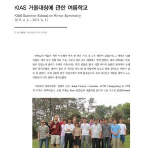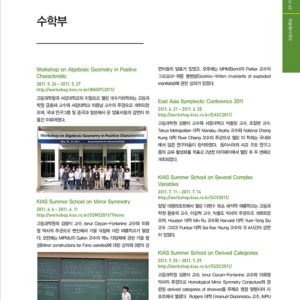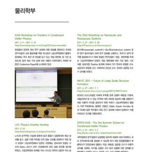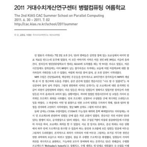 42  |  KIAS 거울대칭에 관한 여름학교|이화영, 고등과학원 수학부 연구원44  |  응집물리학의 최전선|이우람, 고등과학원 물리학부 연구원46  |  2011 한국생물물리학회 정기학술대회|박기현, 고등과학원 계산과학부 연구원48  |  2011 거대수치계산연구센터 병렬컴퓨팅 여름학교|김원섭·이정민, 국가수리과학연구소 계산뇌과학팀