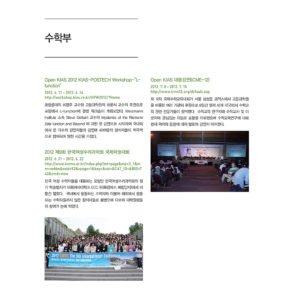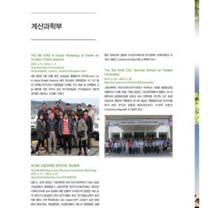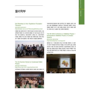 Conference Report30 | 2013년 끈이론학회 후기 | 이성재·Fermi Fellow 고등과학원 물리학부 박사32 | 2013 KWMS 국제학술대회 참석기 | 이정연·고등과학원 수학부 박사33 | Pyeong-Chang Summer Institute 후기 | 강동우·성균관대학교 석사과정37 | RENO-50 국제학회 소식 | 서선희·서울대학교 Brain Pool, 방문교수40 | 제4회 KIAS CAC 병렬컴퓨팅 여름학교 참가 후기 | 김종정·서울대학교 물리학부 연구원 42 | 수학난제연구센터 개소식 및 개소기념학회 | 김소영·수학난제연구센터 행정운영팀장 44 | 학술행사개요 49 | 대중강연 |